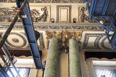 Los pisos de madera del salón y una de las arañas en plena recuperación.En el primer piso, el Salón de Acuerdos es una muestra de laboratorio del nivel obsesivo de este trabajo. El lugar era una maravilla agrisada y hoy está exactamente en pleno renacimiento. Al mirar el cielorraso se puede ver la línea a donde llegaron los restauradores, porque una mitad brilla y es de un crema eduardiano, cálido y luminoso, y la otra es opaca y cenicienta. Las columnas estucadas volvieron a ser verdes, sacadas del amarronado de la edad, mientras que los pisos fueron tratados a mano, con cada clavo de bronce –la fijación original– retomado y cubierto con una masilla del color de la madera. En dos recias plataformas cuelgan las arañas, en plena limpieza y rescate de sus dorados.