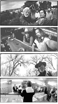 Antes de que el término siquiera existiese, antes de que fuera moda, furor, símbolo del tiempo digital, Bridges ya registraba consistentemente el detrás de escena de todas y cada una de las películas en las que participó usando su cámara Widelux de 35 mm, tomando cantidad de autofotos. Claro que también hay retratos a compañeros, planos generales, etcétera, pero son sus selfies las que han llamado especialmente la atención. Con un ¿muñeco? colgado de un árbol, víctima de linchamiento en True Grit (2010) o junto a Matt Damon mientras ambos son maquillados. Junto a Lloyd Bridges, su padre, en Blown Away (1994), abrazando a Iron Man en la homónima película de 2008, acompañado por una Olivia Wilde ya en trajecito para rodar Tron: Legacy (2010), o bien apoltronado sobre la barra del bar del Big Lebowski, codo a codo con Sam Elliot, ninguna decepciona. Empero, disponibles a través de su web, las imágenes hacen algo más que freezar el backstage; también son una oda cariñosa a su amada cámara de objetivo gran angular. Al respecto, Jeff ha dicho: “La Widelux es una amante volátil; su visor no es preciso y no hay enfoque manual, por lo que es arbitraria en sí misma, una cualidad caprichosa. Me gusta precisamente por eso”.