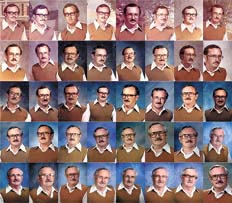 Salvo por el bigote, el pelo —de morocho a canoso— y un coqueto cambio de lentes a la moda, el autoimpuesto uniforme de este maestro de Educación Física no es una mera casualidad: al parecer, después de repetir vestimenta por dos años consecutivos —hecho que lo avergonzó y por el que le solicitó repetir su retrato al director de la institución, que denegó el pedido—, su mujer, Cathy, le propuso convertir el despiste estilístico en una tradición. El aceptó el desafío, y el resto es historia.