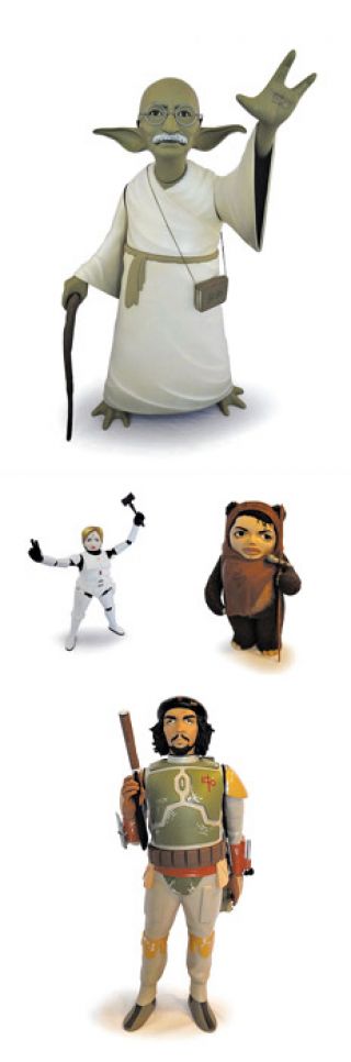 “Documentar el pulso de nuestros tiempos”, fue el lema autoimpuesto por el artista y escultor norteamericano Mike Leavitt, de 36 años, al momento de crear su serie Empire Peaks. Resulta curioso, sin embargo, que haya decidido hacerlo transformando a personajes de la cultura, la política y la historia en... figurines articulados de La Guerra de las Galaxias. “Pienso a mis estatuas como tótem grecorromanos que saludan a sus titanes contemporáneos”, asegura quien talla en madera, adjunta accesorios y pinta con esmalte a base de aceite sus extraños modelos, donde Albert Einstein es R2D2; Steve Jobs, C3PO; Barack Obama, Lando Calrissian; Aung San Suu Kyi, la princesa Leia; el Che Guevara, Boba Fett (controversial); Abraham Lincoln, Han Solo; Donald Trump, Darth Vader (claramente), y Mahatma Gandhi, el maestro Yoda (claramente bis), por mencionar unos pocos casos. “Cada personaje es cómplice de forjar buena porción de nuestro paisaje cultural”, aclara Leavitt sobre los seleccionados para integrar estas satíricas piezas mash-up que parecieran pedir, una vez más, que la revolución sea proyectada. O televisada, más no fuera.