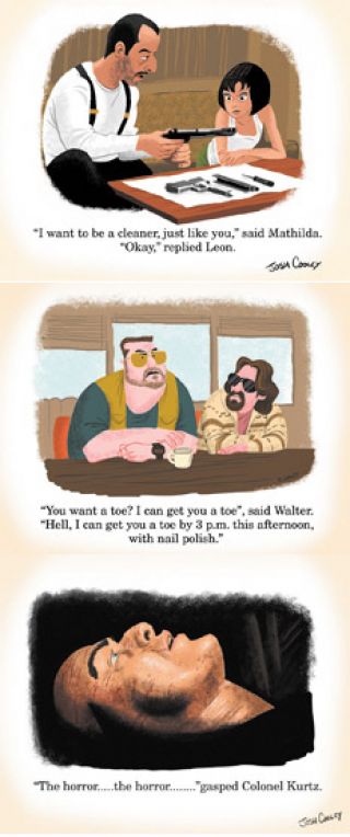 Las apariencias engañan cuando a priori señalan que el libro para infantes de Josh Cooley –ilustrador y artista de storyboards de Pixar– es, en efecto, para infantes. Porque aunque en estilo viñeta animada, los dibujos que componen su muy reciente Movies R Fun! (Las películas son divertidas) juegan con la inocencia cartoon para recrear míticas escenas de films no recomendados para niñatos (al menos, no sin la supervisión de mayores). Así, tomando bravos momentos de Pulp Fiction, El bebé de Rosemary, Fargo, El resplandor, Alien, El silencio de los inocentes o El Padrino –por mencionar unos pocos casos–, el norteamericano usa su talentoso trazo para componer lo que ha dado en bautizar “una colección de clásicos cinematográficos para los cinéfilos preescolares”, que, en realidad, sería una suerte de versión triple equis de los libros infantiles, donde abundan caballos muertos, improperios, asesinos seriales o amenazantes psicópatas, locos y pistoleros. A la venta desde el 1º de marzo en EE.UU., el ejemplar viene con pertinente definición/aclaración: “Una sarcástica celebración de aquello que los fans aman de las películas legendarias en un libro que probablemente no debiera leerse antes de irse a dormir”. Salvo que el lector desee soñar con Samuel L. Jackson recitando pasajes de la Biblia en vez de invocar a dulces angelitos, por supuesto.
