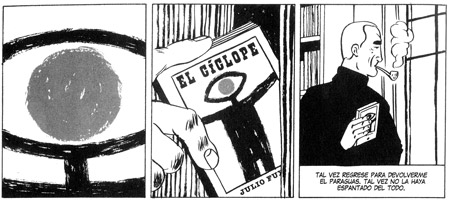 Este mundo cerrado del poeta se ve modificado cuando Mariana, una joven periodista que se acerca a Fux con la excusa de escribir un breve artículo para un suplemento cultural, comienza a ver a través de la fachada del poeta. Una intriga criminal ligada a la joven envuelve a Fux y da unidad a la historia, que cuenta, en esta edición, con dos capítulos inéditos. El poeta, por voluntad propia, decide inmiscuirse, en pos de satisfacer la doble voracidad del cíclope. No es difícil entrever que el policial (en su vertiente negra), uno de los géneros predilectos de De Santis, pisa fuerte en esta obra. “Género negro significa melancolía disfrazada de violencia”, resume el guionista, en una frase que define a la perfección el carácter ambivalente de su personaje.