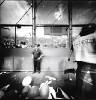 COLOCACION REPLICA PIEDRA MOVEDIZAEsta idea elástica del fotoperiodismo es llevada al extremo en la serie de cámara estenopeica. Añeli cuenta de su elección por este método de registro: “La búsqueda surgió a partir de todo lo que me produjo la llegada del mundo digital a la fotografía. Es una respuesta mía a eso. Una vuelta a las bases y el origen de la fotografía. Empecé con esta técnica que es mucho más lenta, poco precisa y por eso menospreciada, pero no con los temas para los que habitualmente se la usa. Me lo tomé como una revancha. Porque ¿por qué tengo que hacer yo las fotos en digital y con la última cámara que propone el mercado? ¡No! Si ya no dependo de eso para vivir, porque el laburo en los medios lo dejé, entonces no hay ninguna necesidad de estar con la última tecnología. Hago con lo que yo quiero: formato, técnica y tiempo”. Lo singular de la elección de Añeli es que algunos de los temas que captura son los que le quedaron de su trabajo en medios: partidos de fútbol, como la foto “Boca-Vélez”, un cuadrado reticulado de un policía y globos. Mientras sus colegas están con unos lentes gigantes y veloces, él llega con la estenopeica, un método totalmente ineficaz e inapropiado, a encontrar de esa manera un resultado mucho más complejo de lo que a primera vista puede pensarse. Imágenes que acercan la realidad a lo pictórico.