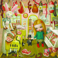Y quizás el causante de este reconocimiento sea Mark Ryden. Sí, muchos de sus compañeros de estilo que desde 1994 empezaron a publicar en la revista Juxtapoz tienen prestigio, pero Ryden logró el objetivo del low-brow: imágenes surrealistas, algo mórbidas, con tanto de Alicia en el País de las Maravillas como de el Bosco, que son realmente populares y al mismo tiempo reconocidas como arte y no mera ilustración; miniaturas, óleos, dibujos blanco y negro, tapas para bandas de rock (One Hot Minute de Red Hot Chilli Peppers, por ejemplo), citas a Manet y a Björk: todo convive en las obras de Ryden, de perturbadora ternura. Allí hay una inocencia corrompida, una mirada infantil morbosa, y una violencia latente que sugiere no sólo la extrañeza y la complejidad del cuerpo humano (niños bautizados con sangre humana, nínfulas pálidas con un tajo en el pecho, hundidas en un baño de sangre), sino algo onírico y detallado, a la manera de Dalí, el Bosco, Brueghel. Algunos críticos lo llaman “el Bosco de chicle” (bubblegum), y hay algo de eso, del pop edulcorado de los años ’50 en los Estados Unidos que sonaba en una década represiva, a punto de estallar. Hay una tensión entre la belleza de sus imágenes y lo oscuro de su contenido; colores pastel para el grotesco, niñas inocentes con juguetes sangrientos, niños rosados y celestes vestidos con uniformes nazis. “El aspecto visual de la cultura pop contemporánea contiene los arquetipos específicos que formaron mi conciencia, y suelo encontrar arquetipos en viejos libros infantiles y en juguetes, que además colecciono. Me siento atraído por cosas que evoquen recuerdos infantiles”, explica Ryden.