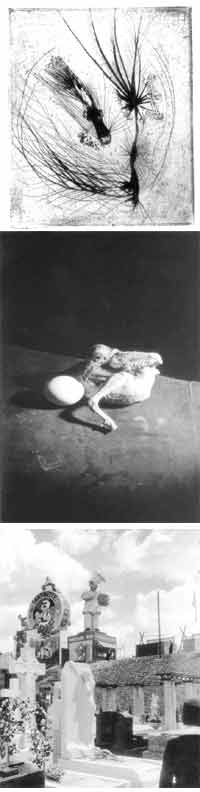 Las fotos son particularmente inquietantes. Podría decirse que parten de la combinación de los postulados del surrealismo y de las enseñanzas de la Bauhaus, de ese encuentro casual y productivo entre elementos de mundos distintos, en contextos extraños, artificiosos e “inapropiados”. El artista elige un modo de disponer los objetos en su habitación de hotel que oscila entre la mirada del perverso y la del científico; o decide buscar el encuentro casual y contradictorio de una escena urbana en sus caminatas por París. También se encandila con el cementerio, a través de puntos de vista y relaciones insólitas.
