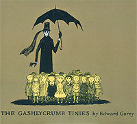 Además ilustraba libros, y son célebres sus trabajos para Drácula o La guerra de los mundos. Así se ganaba la vida, mientras publicaba lo propio, siempre cuentos de infanticidio y crueldad, entre los hermanos Grimm y Goya; es decir, relatos muy cercanos a la literatura infantil que, se sabe, está superpoblada de villanos y niños muertos. Los chicos fallecidos más famosos de Gorey se encuentran en su clásico The Gashlycrumb Tinies, de 1963, que ahora es reivindicado hasta el éxtasis –y si antes no lo fue seguro se debió a un contenido de verdad macabro–. Se trata de niños y sus nombres, en orden alfabético; la imagen es la de sus muertes, o el instante inmediatamente anterior, el texto es la causa. Así: “D es por Desmond, arrojado desde un trineo/ E es por Ernest que se atragantó con un durazno/ F es por Fanny, a quien dejaron seca las sanguijuelas”.