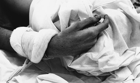 “Saqué en blanco y negro porque revelé lo que había sacado en color y vi los colores de los fluidos del cuerpo. No era lo que me interesaba que se viera. El blanco y negro tenía algo más misterioso. Sentía que tenía que tomar distancia, que había cierto grado de crueldad en manejarme con el color, que volvía todo más realista. Pasé todo un verano ahí. A medida que avanzaba, fui tratando de ‘mostrar’ cada vez menos a las personas –que muchas veces ni siquiera podían darme su autorización–, y por eso empecé a sacar los pies, la mano. Editamos un libro, llamado Terapia Intensiva, con el doctor Reussi. El fotógrafo revela mundos que no vemos todos los días. A muchas personas les mostraba las fotos y no querían ni mirarlas. No todo el mundo quiere saber de esos mundos que están tan cerca.”