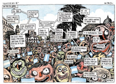 Que la manera de recordar esta Patria de diez Plazas sea con el tono agridulce del humor, la mirada de soslayo y el trazo incisivo de artistas argentinos, placeros confesos y culpables de alboroto popular es una garantía de honestidad intelectual, de amor sin barreras ni vallas protectoras. Veamos, si no.