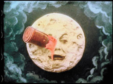 El satélite tuerto de la película más famosa de Georges Méliès: Viaje a la luna (Voyage dans la Lune, 1902).La invención de Hugo Cabret, el libro, es un tomo de más de 500 páginas compuesto de una gran cantidad de texto y profusas ilustraciones en blanco y negro, estilizadas pero muy lejanas del pulido y brillante diseño digital de la película de Scorsese y de la dirección de arte del veterano de las huestes de Fellini, Dante Ferretti. El efecto tridimensional alcanza una de las aplicaciones más “elegantes” de su breve historia, y hasta contó con la bendición de su principal promotor, James Cameron, que la llamó “la mejor película hecha hasta ahora en este sistema”. Lo cierto es que aunque el tema ya se volvió un poco cansador (este fue el año en que los “artistas-de-verdad”, de Wenders y Herzog a Spielberg y “Marty”, jugaron con el 3D), Hugo ofrece algunos momentos estereoscópicos visualmente deslumbrantes. La secuencia inicial, en la que tras sobrevolar los techos de París, Torre Eiffel y todo, ingresamos en la superpoblada e hiperkinética estación de Montparnasse hasta alcanzar la mirada triste pero encendida del protagonista, es soberbia y abrumadora. Luego, el 3D nos permite perdernos en los pasadizos internos en los que pasa sus días, a escondidas, Hugo Cabret. Y hay otra escena particularmente encantadora, que aunque no tiene tanto que ver con el efecto tridimensional sí es producto de la composición digital, que ocurre en los primeros minutos, cuando Méliès le confisca a Hugo su libreta de anotaciones y diseños del autómata, y en el movimiento veloz de las páginas los dibujos cobran vida como en un flip-book, ese otro juguete óptico de los comienzos del cine. Es también por potencia del 3-D que las coloridas recreaciones de los imaginativos sets de filmación de Méliès (mundos marinos y cósmicos con sirenas y monstruos) adquieren el relieve un poco falseado, deliberadamente artificioso, de un diorama.