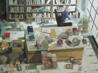 En tu autorretrato, te representás como escritor. Más allá de funcionar como marco para la muestra, una especie de aviso de que lo que se ve fue hecho de esa manera, aparecés como un artista definido por sus libros, por la información que consume y que lo tiene tan ensimismado que ni siquiera puede echar un vistazo hacia la ventana o distraerse un segundo para regar la planta que se le seca al lado. La cita en el título, la idea de que la literatura y no la vida es origen de la literatura o el arte, las referencias a un pasado familiar y la construcción de una genealogía ficticia sitúan tu muestra muy cerca de preocupaciones borgeanas.