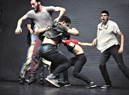 ¿Quiénes están arriba del escenario en esta segunda pieza? Alfonso Barón, que además de bailarín fue rugbier durante años; Pablo Kun Castro, que es tricker, acróbata, artista marcial; Daniel Leguizamón, Jonathan Da Rosa y Lucas Araujo, que vienen de Los posibles, y Amparo González Sola, que como su apellido indica es por el momento la única chica que integra el grupo arriba del escenario.