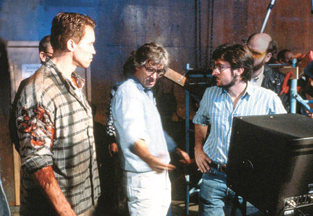 PAUL VERHOEVEN CON ARNOLD SCHWARZENEGGER EN EL SET DE EL VENGADOR DEL FUTURO, 1990