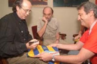 El encuentro se celebró antes de que Serrat ofrezca su tercer y último recital en la ciudad. Y una vez concluida la entrega del carné y la camiseta de Central el cantautor catalán firmó una camiseta auriazul que será sorteada entre los socios de la institución.
