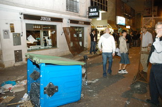 En los pocos minutos que duró la refriega los irracionales rompieron con todo a su paso, principalmente vidrieras de comercios, dañando además el mobiliario de la peatonal con leyendas en aerosol alusivas al presidente de Central. La policía fue a la búsqueda de hinchas de Ñuls, deteniendo en los alrededores a todo aquel que tuviera una camiseta rojinegra.