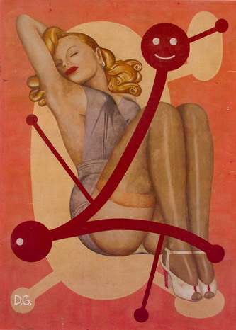 "En mis cuadros, además, hay cierto elogio de la obsolescencia", declara el artista y curador en otro pasaje del citado texto expositivo. "Esta anacronía está buscada mediante la cita (y reactualización) de estilos e imágenes del pasado, tanto de la cultura popular como del arte canonizado". De su serie "Fantasmas", por ejemplo, cuenta que provienen tanto de dibujos animados antiguos y del Pacman como de la obra de Marcel Dzama: fórmula posmoderna de cruce entre lo "bajo" y lo "alto" que en la pintura de García adquiere el particular encanto de la nostalgia. Es la belleza melancólica de los carteles desteñidos, inmunes a los cambios de la moda, irresistibles a fuerza de anacronismo. A la ilusión de "obsolescencia" la logra García simulando óxidos y otros estragos con su proverbial maestría en el dominio del trompe l'oeil y los efectos de decadencia. En ocasiones el recurso funciona deliberadamente como las rayas del celuloide en una película vieja, que ponen en evidencia el dispositivo de la representación.