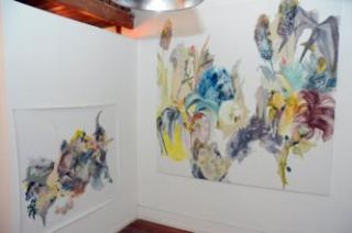 Impactan por su belleza, en la planta baja, la obra en papel calado de Gisela Cortese titulada El tiempo entre mundos y dos obras en técnica mixta sobre lienzo por Florencia Laorden, en el local Ribuar. Cortese presenta un dibujo al modo del arte oriental, sin perspectiva sino abarcador de un universo, y lo traza con el filo de la trincheta con tanta delicadeza que las líneas son nervaduras de sombra proyectada real. El título de la muestra de Laorden es La casi primavera invernal y surge del poético texto de Joaquín Boz que la acompaña. Con firme pulso expresionista, y con un sentido lírico del color que se impregna del ánimo de los cambios de las estaciones, Laorden (que expuso este año en Arte de Santa Fe) despliega, sobre el fondo blanco de la tela imprimada, manchas y líneas gestuales que sugieren formas vegetales pero están al límite de la abstracción.