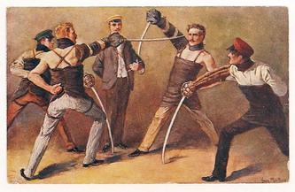 Por ahí andaban, magnetizados hasta en su propios intestinos, chocándose, esquivándose, yéndose, encontrándose a lo largo de años, calles, malos gobiernos. No tenían sepultura pero afanosamente parecían buscarla para sí mismos o para el contendiente: bastaría, según se dijera, que uno cayera para que el otro por reflejo también desapareciese. Eran los duelistas. Así se los conoció. Combatían a cuchillo por una mujer, a la generala por un caballo, al billar por un viaje. Se los vio redondos, alargados, mojados con lluvia y sin ella; atravesados por espinas de zarzas, en carnavales de perros ladradores, en murgas, kilombos, negreríos, bailes, circos, zoológicos ambulantes, esquinas de café. Donde brillaba una daga ahí empezaban, tropezándose en cascadas de nieblas, de nuevo erguidos, prestos al combate y la muerte real. Los últimos tiempos los encontraron más cansados y lentos. Sin llegar a las torpezas del deshonor, ingerían sus propias sombras por errarle al enemigo, o lastimaban un frente de casa pues allí se debatía en finos movimientos, la otra cosa absurda: la sombra del contrincante y contra ella o su espejo multiplicado por los faroles embestían. Nunca hubo ser alguno que los detuviera pues parecían no oír consignas, consejos ni retahílas de separaciones. Sobre el final empezó a llegar una imperceptible bulla desde el fondo de los comedores, de las casitas de madera por Carriego que mugiendo les decían en la luz muerta de la noche con estrella y fondo de tangos que ya estaba bien, que habían vencido, que nadie había ganado nunca. Pero se afanaban cuanto más repulsa imperceptible les dedicaban sus movimientos de baile. Obraban a las mil maravillas como escuderos de un cuento. Noche abajo sus pasados se fueron cocinando a fuego lento sonbre el mangrullo de un aceite que parecía hervir para deleite de un gigante. La Memoria, el Tiempo, todas cosas asombrosas y bestiales los fueron apaleando hasta dejarles las carnes vivas. Por entonces ya eran borrosos los duelistas, eran nada en el espacio, la gente estaba ocupada en las telenovelas y no en apariciones fantasmales de muerte, redención o chuchillaje. Hubo mañanas en que las veredas aparecían gotas de sangre pero se las atribuían a alguna pelea de gatos más que a ellos, devaluados en ardores y leyenda. Fueron tomando distancia con su mito y achicándose, limitándose de frío y de incomodidad: ya nadie quería sostener la charla sobre aquellos dos sujetos que se batían a duelo con cualquier cosa, por cualquier cosa. Entonces sí, alguno una noche lo dijo: la muerte por duelo había pasado de moda. Y todos aprobaron en medio de una asamblea de dipsómanos solitarios y trabajadores de oficios inertes. Los echaron de sus vidas y a nadie más importó el fluir de los aceros desenvainados, ni los gritos de guerra, ni los pasos apresurados de los duelistas al culminar sus batallas, cuando iban a sus guaridas para curarse las heridas que no habían obtenido recientemente. Una noche, sentados en el reborde de cemento del club, los duelistas se nos acercaron. Uno se agachó y lo reconocimos como al más alto: toda su cara era una cicatriz. Un humo azulado le envolvía el torso. El otro más bajo, tal vez más reservado permanecía alejado. Pero fue él el que habló. Nos mostró unas figuritas y entonces, ya en confianza, se nos acercó con ellas en las manos: llevaba surcos de raspones viejos y al igual que el otro su cara toda era un mapa de costurones. Nos extendió un puñado; estaban gastadas pero eran de las más difíciles de conseguir. Después los miramos y oímos que querían: nos estaban proponiendo si queríamos ir a verlos batirse a duelo en la ochava de enfrente, donde termianba la quinta de los Marranos. Es para probar, dijo el alto muy quedamente. Si les gusta nos pueden ir a ver cuando nos juntemos, acotó el otro. Los seguimos, los vimos por fin luchar, pujar y sangrar; luego huir uno por cada lado de la calle, cada cual a su madriguera, heridos por igual, apresurados en no morirse. En unos mes llenamos el álbum y lo cambiamos por la pelota de cuero. Pero no cumplimos al acuerdo y también, como los grandes, nos olvidamos de ellos, los fuimos obviando hasta que uno se acordó del pacto que teníamos y sentimos la punta de un remordimiento, pero ya era tarde, hacía tiempo que no se los veía más por el barrio. Según contaban los grandes terminaron yéndose juntos por un camino de tierra que sabíamos, llevaba a la nada, esa nada de horizonte perruno que solo conocen los criminales, las brujas o los artistas incomprendidos.