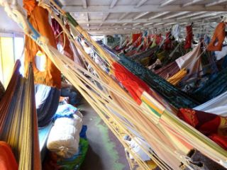 El barco, el barco, el barco... veo a los más chicos bebiendo sin reparo el oscuro fluído de los grifos que es el agua del propio río que nos rodea, marrón y espesa. El barco tiene sed, es ya mediodía, las interminables colas para obtener la comida que incluía nuestro barato pasaje empiezan a formarse. El sol hace resonar el chaperío del techo que se calienta conforme pasan las horas. La gente discute si alcanzará para todos. Pasa que somos muchos, en un barco para 250 personas viajamos infelizmente más de 400. Dicen: "Somos muchos más que de costumbre", y después: "Ah pero qué bien que comen los de los camarotes", porque es bien cierto que los de los camarotes por haber pagado algo más tienen un trozo más grande de pollo sobre su arroz y baño privado y limpio. Y comen primero que todos. Nosotros pagamos la barata tragedia de lo popular, amontonando hamaca con hamaca para caber en el espacio que haya. Es lo que elegimos. Pero para algunos debo decir que es lo que pudieron. Y eso es lo triste. No poder elegir.