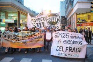 El Movimiento Proyecto Sur sentó posiciones en el plano judicial y en el plano político de la batalla que libra para hacer valer los 60.426 votos que obtuvo su lista para diputados provinciales, encabezada por Carlos Del Frade. Más de dos mil personas marcharon ayer por la proclamación del periodista como diputado provincial, y casi todo el arco político santafesino brindó su adhesión a la causa,incluidos el gobernador electo, Antonio Bonfatti, y la diputada electa María Eugenia Bielsa: "Alguien que obtiene 60.000 votos debe entrar a la Cámara", coincidieron. El partido liderado por Pino Solanas presentó ante el Tribunal Electoral el pedido de rectificación de la distribución de bancas para la Cámara baja y que se le asigne una a quien encabezó su lista.