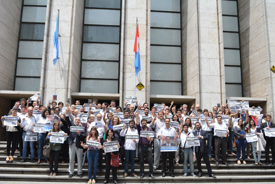 Abogados del foro rosarino se autoconvocaron ayer en las escalinatas de Tribunales para darle su apoyo a la presidencia de Daniel Scioli y reclamar que "no se puede volver atrás", de cara al ballottage del domingo. El referente de la Agrupación de Abogados y Abogadas "Juan José Castelli", Rubén Chiavazza, explicó: "Somos un grupo de abogados que pertenece a diferentes agrupaciones y decidimos autoconvocarnos para expresar nuestro explícito apoyo a la presidencia de Scioli, los que tenemos varios años sabemos lo que significaría un retroceso a la década del 90 con todas las secuelas para la sociedad en su conjunto y en particular a nosotros los abogados".