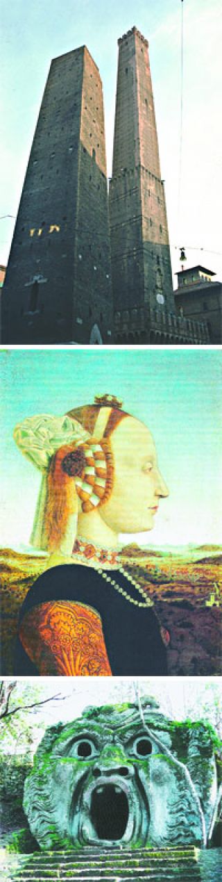 ¿DOS TORRES INCLINADAS? Casi podría decirse que Italia tiene cierta vocación por las torres inclinadas. La más conocida, la que podría reconocerse hasta con los ojos cerrados, es la Torre de Pisa, situada en el bien llamado “Campo dei Miracoli” de la ciudad toscana. Pero hay dos más, en el corazón de Bolonia (Emilia Romagna), que también tienen lo suyo en materia de inclinaciones. Conocidas como “las dos torres” (Due Torri), forman parte de las 17 que sobrevivieron entre las decenas que existían en época medieval. Y tienen nombre propio: Torre degli Asinelli (de 97 metros de altura) y Garisenda (originalmente de 60 metros), por el nombre de las familias que las hicieron construir, en torno del 1119. Casi como las vemos hoy las vio Dante, que las mencionó varias veces en la Divina Comedia.