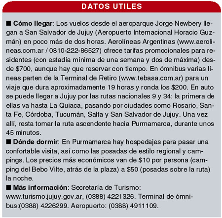 El hombre groso. El jujeño dio una clase tocando guitarra, bombo, siku, tambor y quena.UN LUGAR MAGICO En esa inmensidad de texturas y tonalidades que muestra la Quebrada de Humahuaca, Purmamarca resume no sólo su belleza, sino parte de sus creencias, celebraciones, usos y costumbres, adaptaciones del lenguaje y hasta algunos de sus sistemas productivos, un legado histórico que se ha reproducido por años, y ha sabido conservarse. La paz del purmamarqueño así lo dice. En las cercanías del “pueblo de tierra virgen”, en lengua aimará, Purmamarca muestra su magia en el magnífico Camino de los Colorados, una caminata interna que ofrece de cerca la gama de tonalidades que se combinan en las laderas del Siete Colores, contrastando su perfección con la aridez del paisaje, cubierto de cactus y cardones. Sobre la calle de entrada (donde desembarcan los colectivos) algunas agencias ofrecen la excursión a las Salinas Grandes, un mar blanco al que se llega atravesando el Paso de Jama, el punto más alto de Jujuy a 4170 m.s.n.m. Esta visita cuesta entre $30 y $50 pesos y no puede dejar de hacerse.
