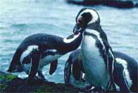Delicias conyugales Al recorrer la pingüinera el bullicio de graznidos es constante. Las parejas se llaman continuamente (siempre queda unoempollando en el nido –el macho o la hembra– mientras el otro va al mar en busca de comida). Su voz suena como un rebuzno y lo repiten y repiten extendiendo las aletas con el cuerpo arqueado para atrás y el pico abierto hacia el cielo. Los pichones hacen su aporte al alboroto y emiten un piar sibilante y continuado para reclamar por su alimento.