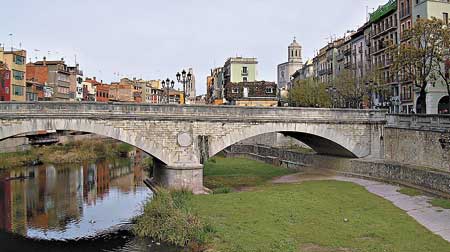CIUDAD DE PUENTES Gerona tuvo antaño un problema que hoy es su bendición, la unión de las dos orillas en que se divide la ciudad. Los puentes trajeron la solución y una estética distintiva con ineluctables reminiscencias venecianas, pero al estilo catalán, es decir, con carácter propio. Uno de los más emblemáticos, el Puente de Piedra, fue construido en el siglo XIX durante el reinado de Isabel II y comunicó desde entonces ambas márgenes, el casco antiguo con el área más joven. Bajo el Pont de Pedra, el Onyar murmura con sus sucintas aguas que alguna vez fue río furioso; aun así, como un delineador de ojos, refuerza la mirada del puente y hace de zaguán a las casas. Gerona es una ciudad llena de “locaciones”, diría un productor cinematográfico. Esta es para la escena del abrazo.