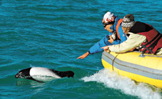 En la isla Elena está la Barranca de los Cormoranes, un acantilado donde anidan más de cien parejas de cormoranes grises, un ave endémica de Santa Cruz. También comparten estos acantilados rocosos con los cormoranes de cuello negro, que se sumergen hasta 40 metros bajo el agua para buscar alimento. Pero la especie más interactiva con los viajeros es la blanquinegra tonina overa, que pasa en grupos de cuatro y cinco como flechas debajo de la lancha. Por momentos, las toninas nos juegan carreras y se colocan justo delante de la proa, dando saltitos regulares para tomar aire a 50 km/h. Luego, en la Isla de los Pájaros desembarcamos para observar el espectáculo familiero de los pingüinos de Magallanes y caminamos entre estas simpáticas avecitas vestidas de frac, indiferentes a las personas que los miran con toda curiosidad.