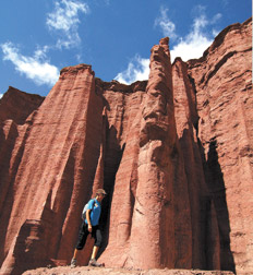 En el camino surgen caprichosas formaciones de sedimento y solitarias columnas sosteniendo una gran roca en lo alto. Y a lo lejos parecen erigirse antiguas ciudades amuralladas, catedrales góticas y esfinges rojas esculpidas por la erosión a lo largo de los siglos.