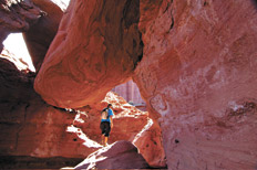 En la Quebrada Don Eduardo se camina bajo rocas gigantes despeñadas hace milenios.TREKKINGS SENCILLOS En el parque se pueden hacer tres trekkings por diferentes lugares. Los más cortos y sencillos –que se complementan bien con el recorrido clásico por el Cañón de Talampaya– son los llamados Ciudad Perdida y Cañón Arco Iris, que duran alrededor de tres horas redondeando una visita de un solo día al parque.