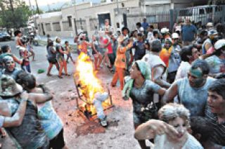 A su alrededor corretean niños que juegan con espuma, pintura, agua y harina. Los jóvenes y adultos también se tiran con todo, pero además beben, y mucho. El tinto riojano, con tónica y mucho hielo, corre como el agua en la plaza de este barrio. Y así es, y será, durante todo febrero.