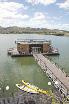 El embalse de Potrero de los Funes, con la confitería flotante del hotel en la orilla.FRESCURA CERCANA Tres cuartos de hora de caminata, trekking o paseo. Es todo lo que hace falta para concretar la promesa de frescura –más que deseada cuando aprieta el calor puntano- para llegar hasta el Salto de la Moneda, uno de los circuitos más populares y accesibles desde Potrero de los Funes. El sendero empieza después de atravesar el badén que cruza el río Potrero (surgido de la unión de los arroyos Las Balsas y Los Molles) y siguiendo aguas arriba, entre espinillos y talas que forman gran parte de la vegetación. Aquí y allá, el curso de agua aparece y desaparece según los vaivenes del terreno, pero su sonido refrescante siempre acompaña, como acompaña el canto de las aves que parecen transmitirse, no sin cierta alarma, la noticia de la presencia de extraños en su protegido paraíso. Así se llega, tropezón más o tropezón menos, entre piedras y vados, hasta el salto de agua: una cascada que vuela sobre la roca desde unos 15 metros de altura, para caer sobre un piletón natural rodeado de verde que tiene como escenario el cordón del Lince y, como espectadores vigilantes, algunos jotes que planean sobre las sierras. Blanca y espumante, el agua dibuja una estela sobre las laderas cubiertas de helechos, y se convierte en la protagonista de las fotos que intentan capturar su paso fugitivo acariciando la roca.