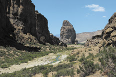 Regresamos por otro sendero, donde nos topamos con escaladores profesionales. Estamos en el camino denominado Sueño Lento, en el que se puede escalar a 240 metros de altura, y más adelante está el Big Bang, un poco más escarpado y complejo. La actividad en este sitio es sólo para profesionales, pero igual se puede disfrutar del paisaje siguiendo distintos senderos de trekking. Al hacer un alto para refugiarnos del sol entre las rocas llegamos a La Matriz, una hendidura donde según Marcela, nuestra guía, se recarga energía vital. Cumplimos con el rito de visitarla y continuamos viaje siguiendo el curso del río Chubut, convertido en este tramo en un débil arroyo, el único que nace en la Cordillera y desemboca en el Atlántico. La excursión culmina unos kilómetros más adelante, con un picnic a la sombra de los sauces, que lloran a orillas del río.