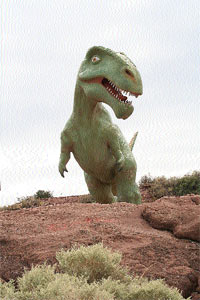 Antes de terminar la visita a El Chocón se puede pasar por su capilla, cuya principal curiosidad es una figura de la Virgen instalada sobre un tronco petrificado. Al volver hacia la Ruta 237, que une Bariloche con Neuquén, el último dino saluda a los visitantes desde un promontorio rocoso que domina el lago. Es una réplica de cemento del “giganoto”, que sorprende a los automovilistas y recuerda, como los carteles al borde de la ruta, que El Chocón es la tierra de los dinosaurios, el “Cretassic Park”.