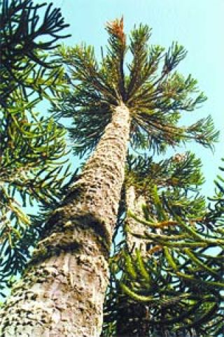 La extraña conífera conocida popularmente como araucaria –pehuén en lengua mapuche– tiene 70 millones de años de existencia en la Tierra. O sea que fue contemporánea de los dinosaurios. Solamente crece en Chile y Argentina, en una franja de 200 kilómetros de ancho que va entre los paralelos 42 y 37 en la Cordillera de los Andes. Como ocurría con los árboles más antiguos de la Tierra, está la araucaria hembra –que tiene una piña verde– y el macho, con su piña color naranja que la fecunda. El tronco es largo y rugoso, con una protección contra la nieve que también protege al árbol de los incendios. Llega a medir hasta 35 metros y se ramifica recién en la parte superior, donde forma una especie de parasol. De alguna inexplicable manera, al ver estos árboles se percibe de inmediato su antigüedad milenaria, que en general oscila entre los 800 y los 1000 años.