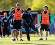 En estos momentos, los titulares de Maradona son Romero; Otamendi, Demichelis, Schiavi, Heinze; Gutiérrez, Mascherano, Verón, Di María; Higuaín, Messi.