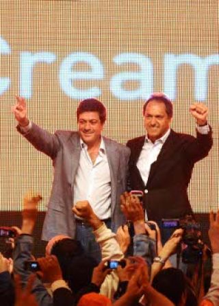 Antes de partir hacia el bunker de la presidenta, Cristina Kirchner, el reelecto gobernador bonaerense, Daniel Scioli, agradeció "el respaldo por confiar en el trabajo que se está llevando adelante" y resaltó que es parte del "gran proyecto nacional que comenzó aquel gran presidente, Néstor Kirchner". El gobernador aseguró que "lo que se viene puede ser mejor aún; cada vez somos más los que creemos en este camino, en este proyecto que nos va a llevar a una Argentina cada vez más desarrollada". Con el 90 por ciento de las mesas escrutadas, Scioli obtiene un histórico el 55,47 por ciento de los votos; seguido por el candidato de Udeso Francisco De Narváez con el 15,82,1 por ciento. La candidata del Frente Amplio Progresista (FAP), Margarita Stolibizer, consigue el 11,51 por ciento.