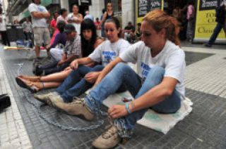 Cuatro mujeres y un hombre iniciaron esa protesta en el marco de los reclamos abordados hace quince días por los trabajadores ambulantes que fueron expulsados por el gobierno porteño de la peatonal Florida. Otras diez personas con cadenas y candados en los pies se ubicaron en la esquina de esa calle con Lavalle, portando carteles que dicen "Macri no mandes a gente patotera que somos trabajadores" y "PRO=POBREZA, pocos ricos".