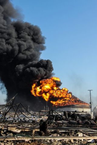 Los bomberos continúan rociando agua y espuma sobre los tanques, pero el combustible almacenado seguía ardiendo, mientras las autoridades dijeron que patrullas militares recorrían las ciudades cercadas para preservar el orden público.