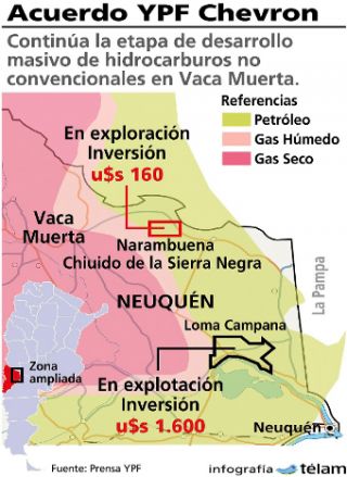 El presidente de YPF, Miguel Galuccio, informó que "Chevron decidió continuar su sociedad" con la petrolera bajo control nacional "para avanzar en la etapa de desarrollo masivo de hidrocarburos no convencionales en Vaca Muerta, tras haber culminado exitosamente el proyecto piloto iniciado el año pasado". En esta etapa, se explorarán en conjunto con YPF nueve pozos por una inversión de 1740 millones de dólares.