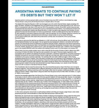 El título de la solicitada que lleva la firma de la Presidencia señala que "Argentina wants to continue paying its debts buy they they won`t let it" (Argentina quiere continuar pagando sus deudas pero no lo dejan). El texto explica que el default que sufrió el país en 2001 "fue el más grande en la historia financiera del mundo" y que las consecuencias causaron "un desempleo cercano al 25 por ciento y más del 50 por ciento de la población por debajo de la línea de pobreza".