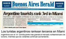 Más adelante, la Presidenta agregó que "se ve que los que trabajan para el monopolio tienen prohibido leer otros diarios, o no saben inglés… Por qué decís lo de inglés? Y, porque no deben haber leído el Buenos Aires Herald del día 2/1/15. Sí, el que se publica acá en Argentina. Sí, así como lo leés: 'Turistas argentinos rankean terceros en Miami'… Y además, por si no te alcanza el título, el articulo sigue: 'Son el 14º contribuyente más grande al mercado norteamericano de turismo. Mientras que los visitantes continúan aumentando'. Leíste bien no? Te repito, en turismo: 3º en Miami y 14º en EEUU… Te aclaro que en la ONU están registrados 193 países. Qué tal? Ni 'cepo', ni devaluación -continuó Cristina-: Poder adquisitivo y políticas públicas de Gobierno, salario mínimo, vital y móvil más importante de la región, inclusión y movilidad jubilatoria, aumentos salariales en convenciones colectivas de trabajo como en ninguna parte del mundo, etc.".