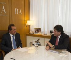 El gobernador bonaerense y precandidato presidencial por el FpV, Daniel Scioli, mantuvo un encuentro con su compañero de fórmula presidencial, el secretario Legal y Técnico, Carlos Zannini, para "coordinar una agenda de trabajo", según se informó.