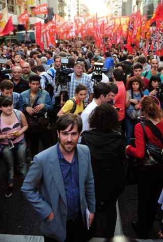 En el escenario montado Corrientes y Montevideo, Del Caño pidió el voto de quienes acompañan "la estrategia anticapitalista y socialista" del FIT, pero también de "todos los que saben que el Frente de Izquierda es la única fuerza que va a defender consecuentemente los derechos de trabajadores, mujeres y jóvenes".