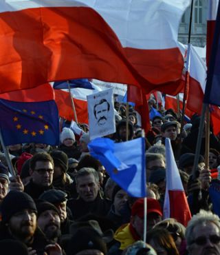 Los manifestantes se reunieron bajo el lema "Nosostros, el pueblo" a convocataria del Comité de Defensa de la Democracia (KOD), un movimiento cívico surgido espontáneamente para oponerse a las controvertidas medidas del Partido Derecho y Justicia (PiS) de Jaroslaw Kaczynski, en el poder desde octubre pasado.