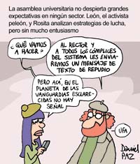 Para Cristian Bay (La Vallese), consejero superior por la mayoría estudiantil, la asamblea “todavía está muy fría. Lo que sí es seguro es que no se va a avanzar sobre los temas importantes, como el tema del gobierno. No vemos que vaya a ser una reforma que quede en la historia, parece más de compromiso que otra cosa”. Para Cristian Henkel (PO), copresidente de la FUBA, es “probable” que sesione la asamblea “porque se acercan las elecciones de decanos y, más adelante, del rector. La asamblea es la excusa para reagrupar sus espacios, por supuesto que no va a ser para resolver los problemas profundos de la UBA”. Por lo pronto, la FUBA se va a reunir en un “plenario general abierto en donde la idea es discutir la posición que se va a llevar a la asamblea –dijo Henkel–. La FUBA empuja una reforma profunda del estatuto, apuntando al gobierno y la representación de los claustros, pero vemos que difícilmente será posible si se tiene que decidir en una asamblea representada por las minorías reunidas en camarillas que solamente quieren mantener su cuota de poder en la universidad.”