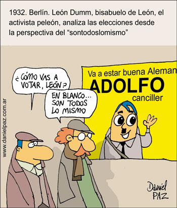 Entre la mayoría de carteles de los partidos de izquierda que conducen el centro de estudiantes se cuela uno del Movimiento Universitario Evita, que denuncia: “En Sociales Macri se viste de Rojo y creó un frente electoral: se llama Oktubre”, referencia al llamado al voto en blanco, y al que Germán, estudiante de Sociología, parece adherir. “Voy a votar en blanco, porque Macri y Filmus más o menos plantean lo mismo. Hasta cierto punto el Gobierno es responsable de que haya ganado el macrismo porque dividió lo que sería el progresismo tirándole todos los dardos a (Jorge) Telerman”, dice, tomando distancia de las leyendas que cuelgan unas sobre otras.