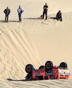 Gordon llegó a Arequipa y relató su experiencia: “Salimos a buen ritmo. En un momento dado, al encarar lentamente lo alto de una duna, el coche se hundió de golpe y cayó de trompa. Tenía la esperanza de que cayera sobre las cuatro ruedas, pero parece que eso era pedir demasiado. Después pivoteó y terminamos apoyados sobre el techo, con el parabrisas y, sobre todo, el radiador, destrozados y eso que la vuelta de campana se ha producido a menos de 10 km/h... Esperamos a que nos trajeran un radiador nuevo y después continuamos con la especial, en lo que fue un fin de etapa larguísimo. No sé por qué, pero estamos viviendo un rally terrible. Nos persigue la mala suerte. Un buen coche, un buen equipo, es el piloto quien falla. Una lástima. Vamos a reflexionar seriamente acerca de si merece o no la pena continuar con la carrera...”. También penó el mendocino Lucio Alvarez (Toyota), que rompió el tren delantero de su camioneta y se retrasó al 27º lugar. El mejor argentino, Orlando Terranova (BMW), viaja en la 15ª posición, y es muy buena la actuación de Emiliano Spataro (Renault), 31º.