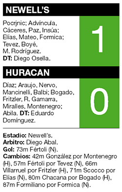 Huracán perdió ayer 1-0 ante Newell`s, en Rosario, y se alejó del puntero de la zona 2, Lanús. A los 27 minutos del segundo tiempo, Lucas Boyé recibió un rechazo cerca de la medialuna del área y habilitó para la solitaria entrada del ingresado delantero Héctor Fértoli, quien se la picó a Díaz y marcó el gol de la victoria. La polémica del partido se había producido a los 28 minutos del primer tiempo: Nehuén Paz derribó a Ramón Abila y el árbitro, Diego Abal, en vez de cobrar penal, sancionó tiro libre afuera del área.